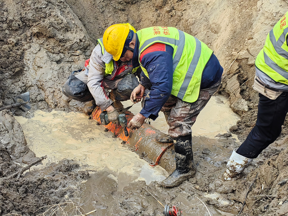 搶修現(xiàn)場(chǎng),因管線漏水導(dǎo)致路面塌方嚴(yán)重,確認(rèn)漏點(diǎn)后,搶修人員緊急制定搶修方案,同時(shí)給下游客戶下停水通知。受現(xiàn)場(chǎng)施工條件所限,挖掘機(jī)清理完上層堅(jiān)硬的砂石后,剩下的泥土只能用鐵锨一點(diǎn)點(diǎn)挖出。為縮短搶修時(shí)間,隊(duì)員們冒著零下8℃低溫天氣,全然不顧被泥水打濕的衣服和鞋子,站在冰冷刺骨的泥水里,徒手安裝螺栓。經(jīng)過(guò)5小時(shí)的連續(xù)奮戰(zhàn),最終比計(jì)劃時(shí)間提前4小時(shí)完成搶修,把因停水給居民帶來(lái)的影響降至最低,過(guò)往群眾紛紛為搶修隊(duì)員點(diǎn)贊。