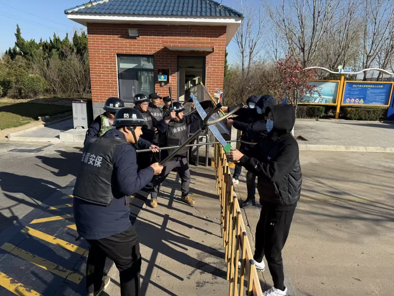 本次演練模擬了名恐怖嫌疑人攜帶管制刀具強(qiáng)行闖入第一平原水庫(kù)、惠澤水廠加藥間,企圖破壞水庫(kù)防汛設(shè)施、投毒并實(shí)施暴力活動(dòng)的場(chǎng)景。值班人員發(fā)現(xiàn)可疑人員后,立即上報(bào)公司領(lǐng)導(dǎo),同時(shí)啟動(dòng)應(yīng)急預(yù)案,并攜帶防刺服、盾牌、鋼叉等防暴裝備趕往現(xiàn)場(chǎng),對(duì)嫌疑人實(shí)施圍捕。經(jīng)過一番激烈搏斗,最終成功制服嫌疑人