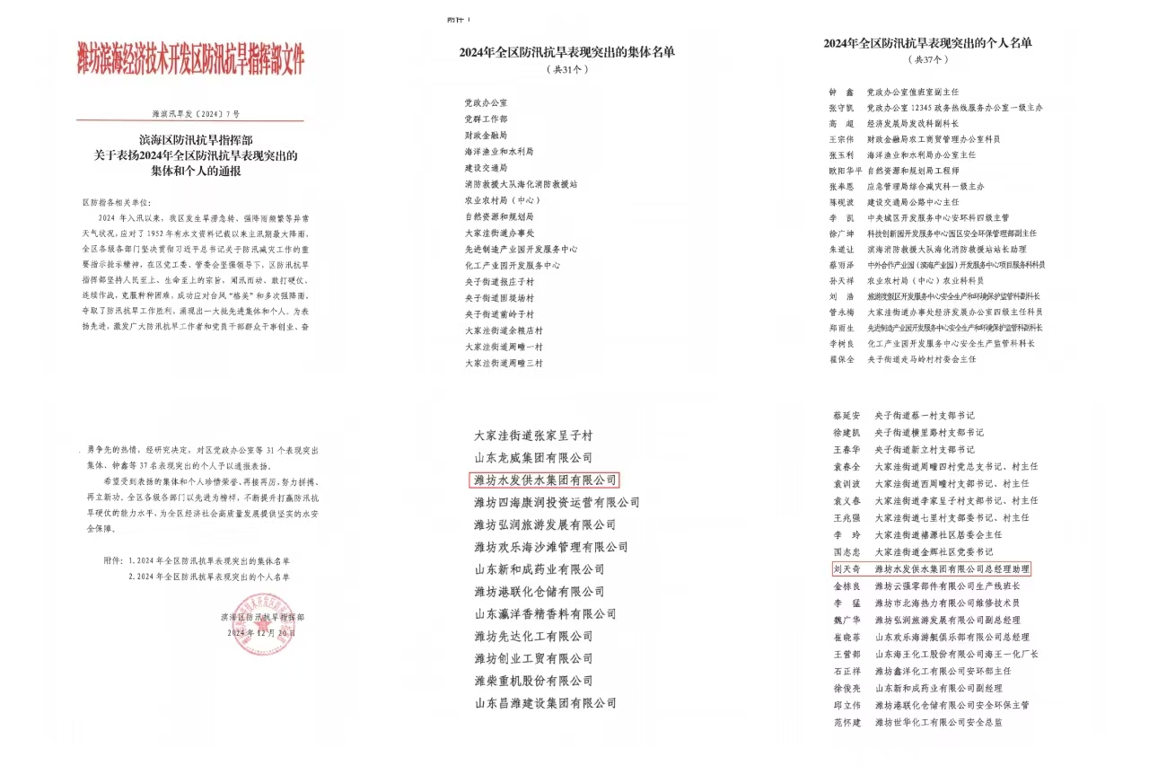 近日,濰坊市濱海區(qū)防汛抗旱指揮部下發(fā)《關(guān)于表?yè)P(yáng)2024年全區(qū)防汛抗旱表現(xiàn)突出的集體和個(gè)人的通報(bào)》,濰坊水發(fā)供水集團(tuán)及公司員工劉天奇,分別榮獲防汛抗旱表現(xiàn)突出的集體和個(gè)人表彰。